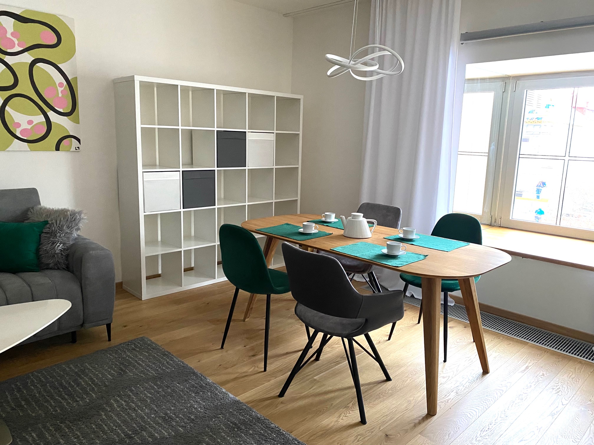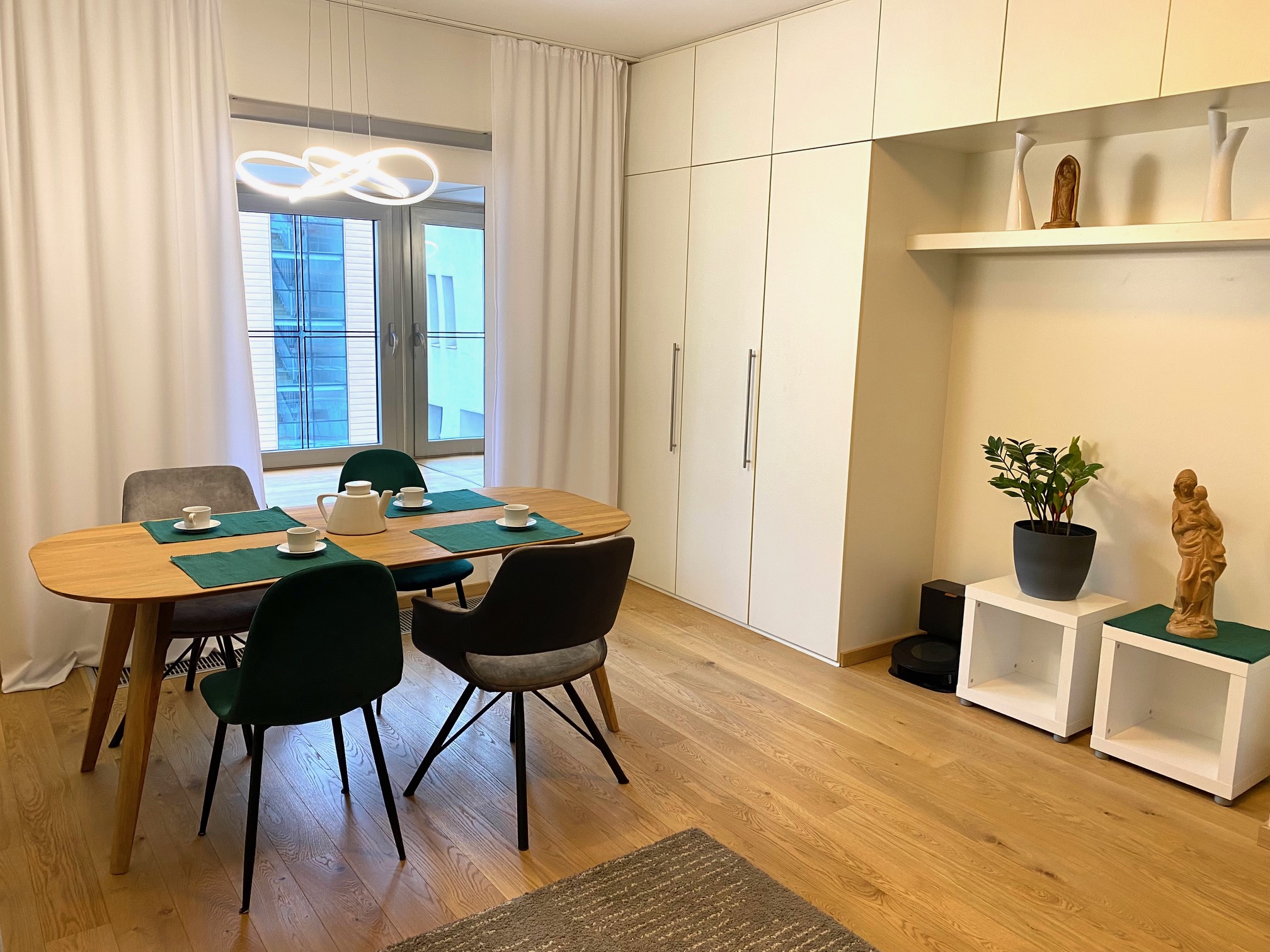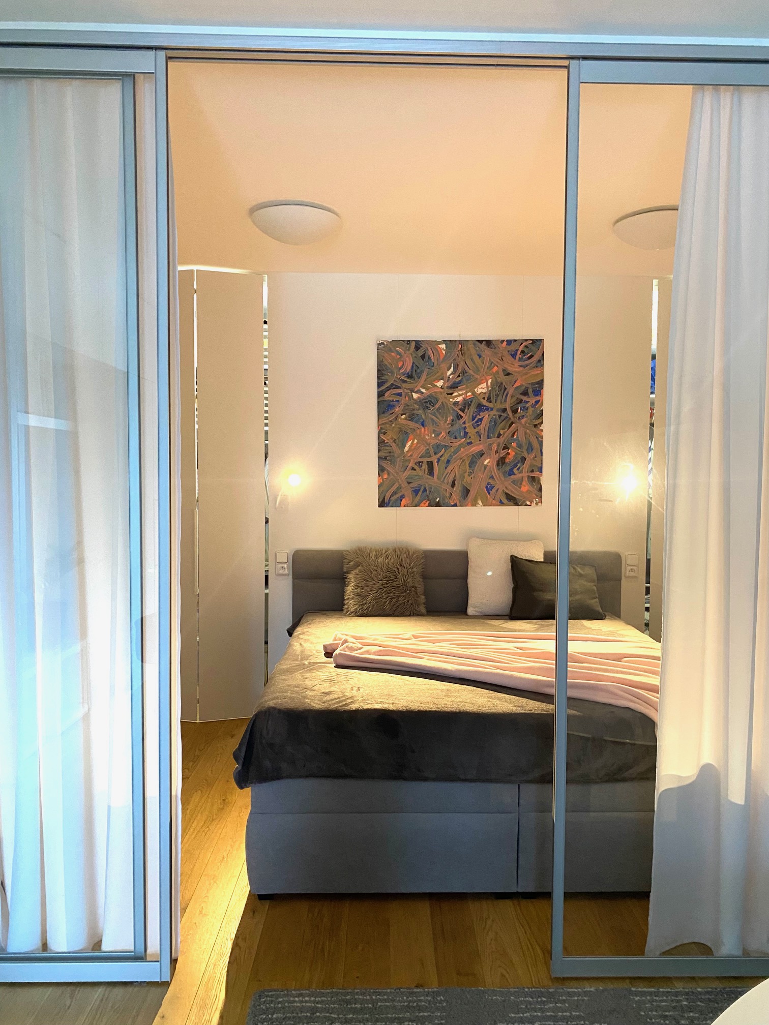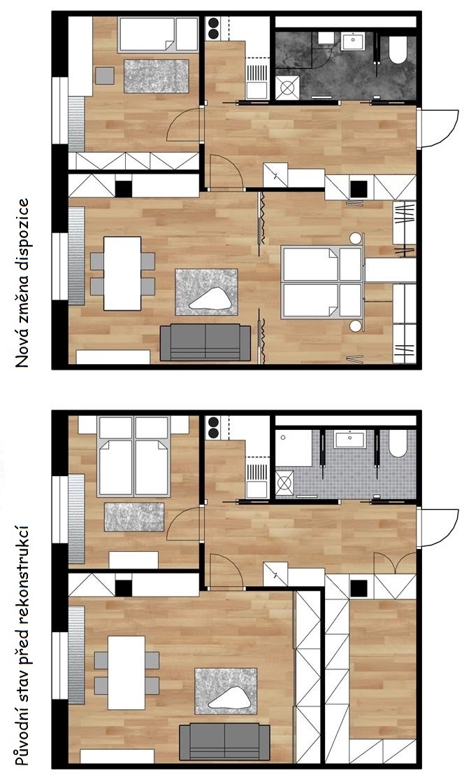Hlavním cílem rekonstrukce byla změna dispozice, to si vyžádalo výměnu podlahy v celém bytě. Z původní dispozice 2+kk jsem vytvořila novou dispozici 3+kk, čeho jsem dosáhla posunem příčky a zrušením technické místnosti. V zadní části bytu jsem navrhla samostatnou šatnu s ložnicí, která je od obývacího pokoje oddělená pomocí posuvné prosklené příčky se závěsem. V bytě zůstal zachován stávající bílý  vestavěný nábytek a dubové dveře. Dominantou obývacího pokoje je dubový jídelní stůl a šedá sedací souprava.