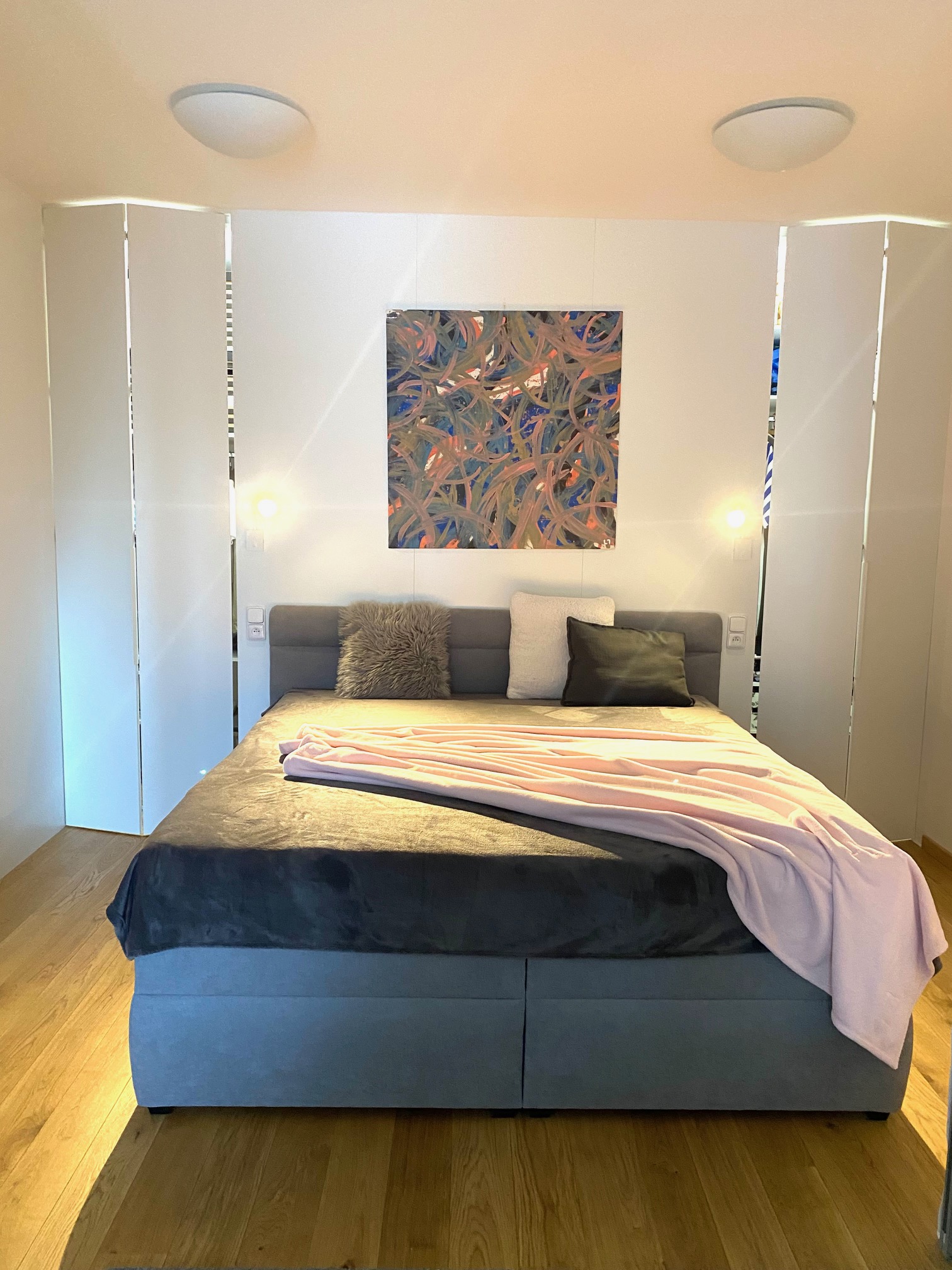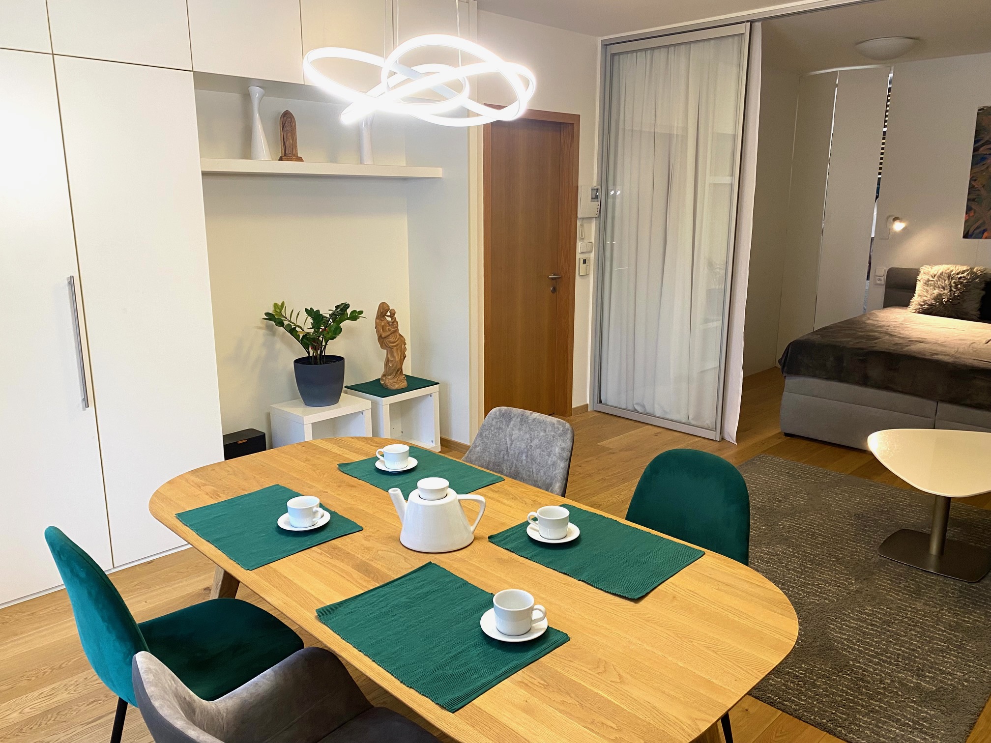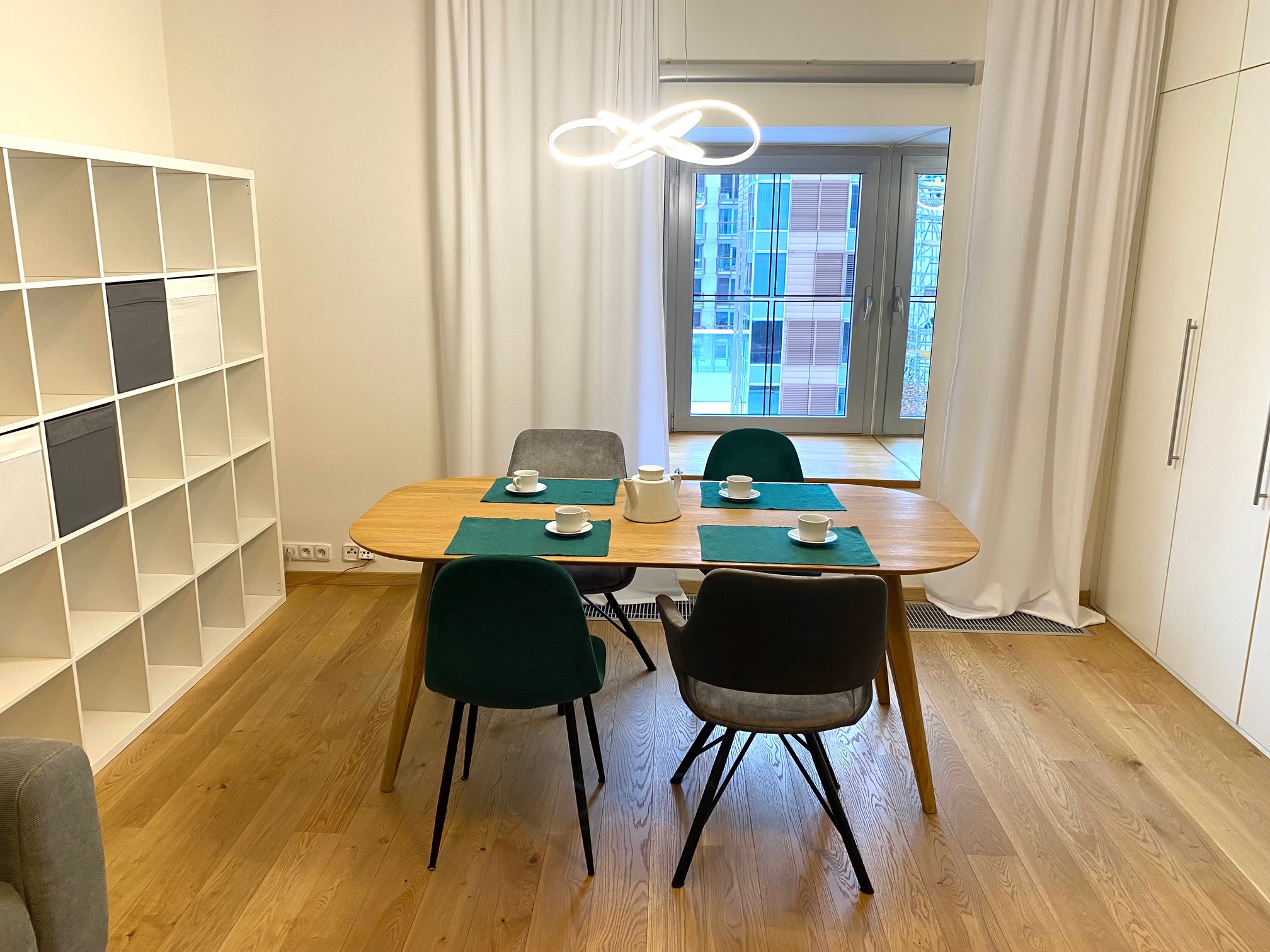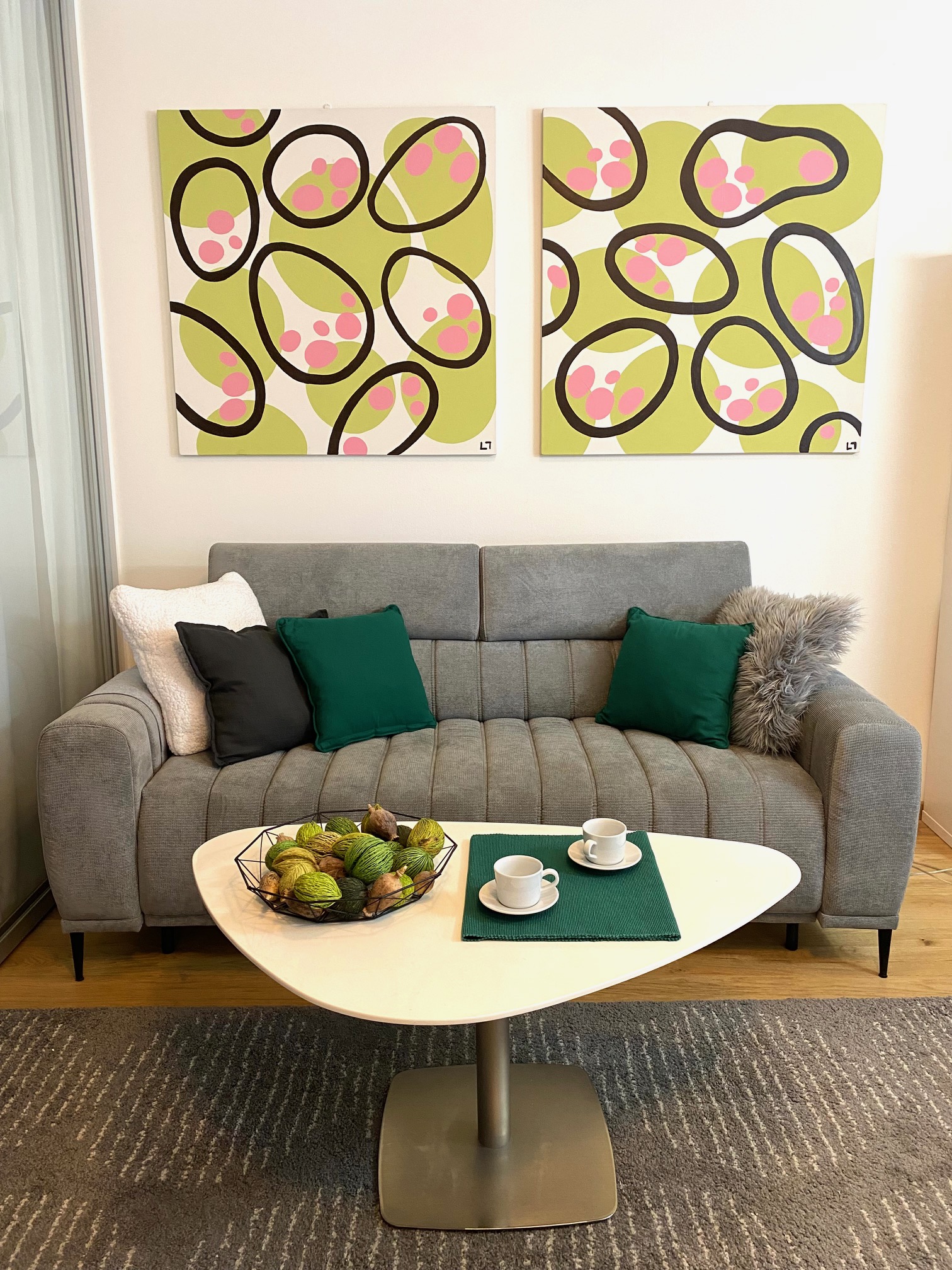 Hlavním cílem rekonstrukce byla změna dispozice, to si vyžádalo výměnu podlahy v celém bytě. Z původní dispozice 2+kk jsem vytvořila novou dispozici 3+kk, čeho jsem dosáhla posunem příčky a zrušením technické místnosti. V zadní části bytu jsem navrhla samostatnou šatnu s ložnicí, která je od obývacího pokoje oddělená pomocí posuvné prosklené příčky se závěsem. V bytě zůstal zachován stávající bílý  vestavěný nábytek a dubové dveře. Dominantou obývacího pokoje je dubový jídelní stůl a šedá sedací souprava.