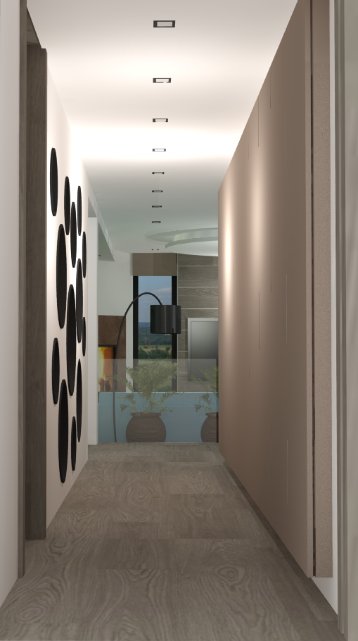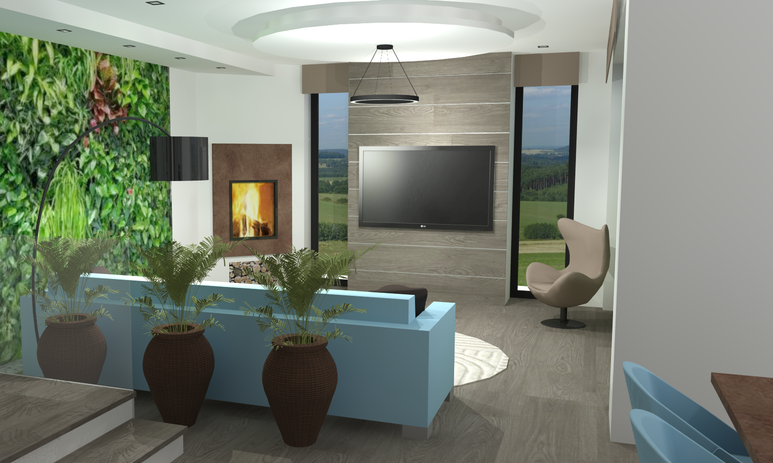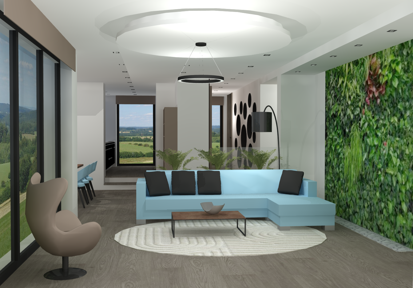 Celý dům byl navržen ve funkcionalistickém stylu, maximálně prosvětlen přirozeným světlem, všude byla velká okna, takže nebyl problém použít v interiéru tmavší barvy jako je tmavě hnědá, černá tapeta, doplněná bílou a krémovou.  Ze sedačky v obývacím pokoji je výhled buď do zahrady, na TV, nebo na krb. Za sedačkou jsou umístěny květináče s kytkami a tvoří tak pomyslnou zeď mezi chodbou a obývacím pokojem. Hlavní osvětlení v obývacím pokoji je řešené jako podsvícený sádrokartonový kruhový podhled s centrálním světlem uprostřed. Zajímavým prvkem na chodbách je zeď s nikami ve tvaru kruhů, které jsou podsvícené.